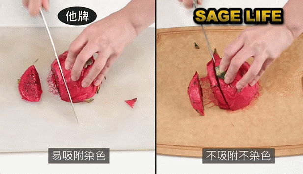我們用火龍果做了一下對比,烏檀木實木整切菜板,它在日常使用中也不容易染色,串色,串味易清洗。